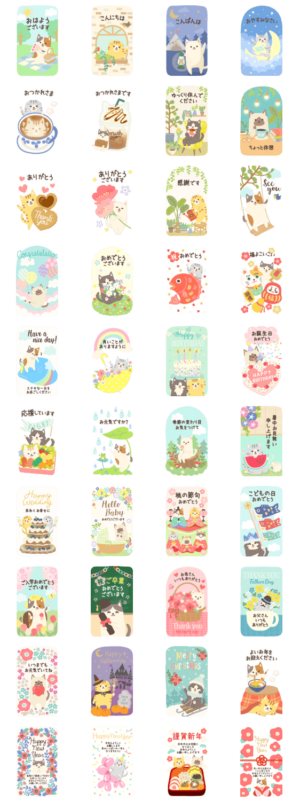甘さ控えめ大人女子向け猫のグリーティングカード♪毎日のあいさつ、敬語、お祝い、挨拶・気遣い言葉。 茶トラ、ハチワレ、三毛、スコテッシュ、サバトラ、シャム、白ねこ ※このスタンプはトークルームで大きく表示されるBIGスタンプです。mush より発売