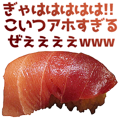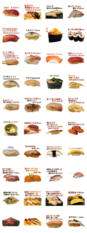 どこかうざいお寿司のスタンプです。ウザいお寿司で飯テロしながら煽りましょう。ダジャレ。魚介。まぐろ、サーモン、あわび、トロ。実写写真面白いムカつく食べ物スタンプ竹野チコ より発売