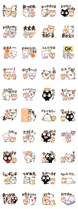 『ちびミケ』の三毛猫や、『クロネコすたんぷ』、『やさしいクロネコ』の黒猫等、『かたこ』作成のねこたちと、豆柴の犬のスタンプです。イヌネコ好きな方にぜひ。かたこ より発売