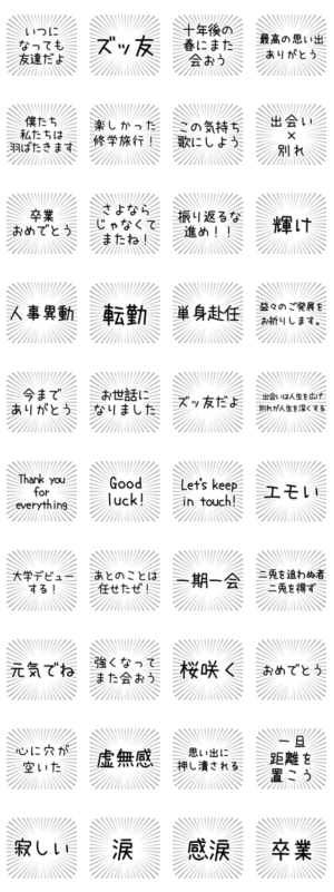 卒業、就職、進学、転勤、人事異動のときに使えるやつ。ズッ友をはじめお世話になりましたなど。さよならじゃなくてまたね。ビジネスでも使えるやつも入れてます。みやや より発売