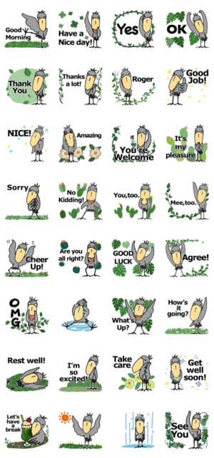 ハシビロコウとサボテンなど緑の植物の毎日便利な優しいスタンプ英語版です♪トマト より発売