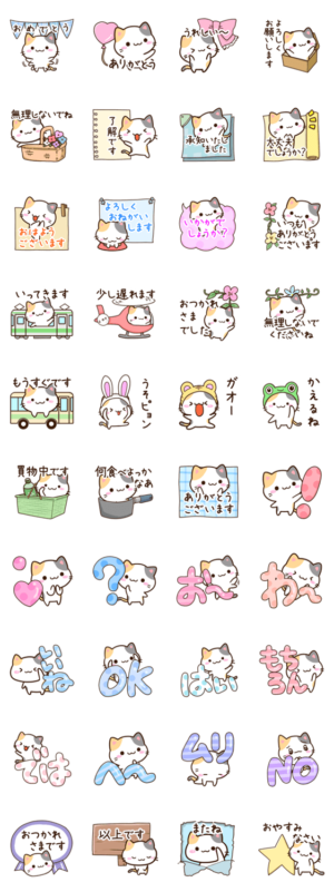 『小さい三毛猫』の大きな文字やかわいい飾りのついた便利なネコスタンプです。家族連絡や待ち合わせ等、毎日のあいさつもあります。ミケねこが好きな方にぜひ。【かたこ】かたこ より発売