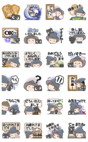魔女見習い まじょると黒ねこが楽しく飛びだすスタンプです。
