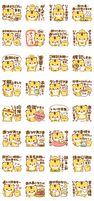 お仕事に♪毎日のあいさつ・連絡に♪いろいろ役立つトラさんの敬語スタンプです。ぴよたぬき♡ より発売