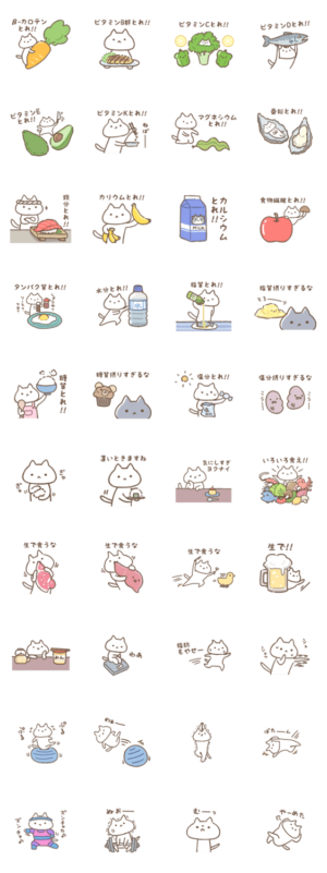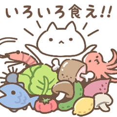 様々な食べものを食べるように勧めてくれる猫ちゃんのスタンプです。食生活を振り返りたくなりますね!