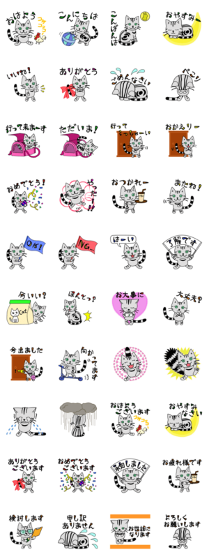 いつもの挨拶や丁寧な挨拶、日常で使える内容のスタンプです。白い枠を付けているので黒背景でも使えます。小さいアメショーのぽんこちゃんをよろしくお願いします。