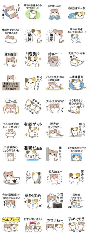 お疲れ気味やる気が出ない時に使えるゆるかわ三毛猫とキジトラ白猫のスタンプ第5弾 仕事 締め切り 進捗 社畜 気づかい 気圧 春夏秋冬 花粉症 お祝い 敬語 残業