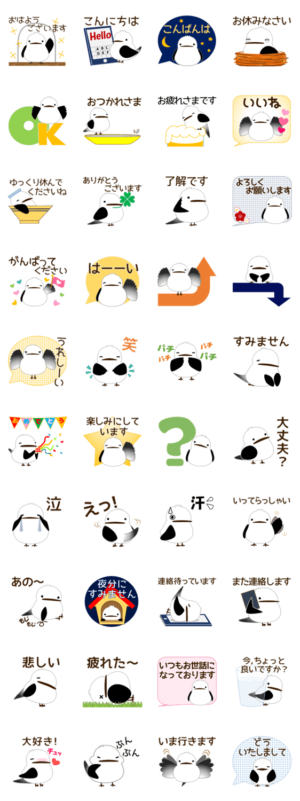 白い鳥のふわふわシマエナガ。字がはっきりしていて見やすく、敬語で使いやすい言葉を集ました。ゆるいスタンプ。ありがとう、おはよう、おつかれさま、了解、おやすみ等
