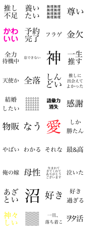アイドル,アニメ,女優,俳優,声優,K-POP等のファン向け明朝体スタンプ。文字/言葉/ジャニー/ヲタク/好き/かわいい/尊い/愛/金欠/坂道/天使/神/沼/萌/面白い/ネタ/LIVE/返信
