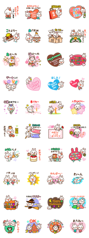 お正月、クリスマス、節分、ハロウィン、バレンタインデー、卒業・入学・入社、お花見、子供の日、母の日、誕生日など年間行事に使える「ブチうさぎ」のスタンプです。