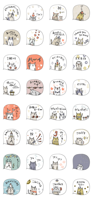 珍しい吹き出しタイプのスタンプで猫ちゃんが可愛い!日常で使える挨拶や敬語のスタンプもあるので毎日使えそうです。