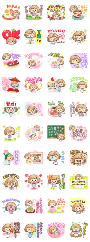 おかっぱの女の子の優しい励まし共感スタンプ♡新生活.日常会話.敬語.卒業入学.誕生日おめでとう.お祝い.母の日父の日etc☆桜がかわいい♪トークにパッと春を咲かせてね~