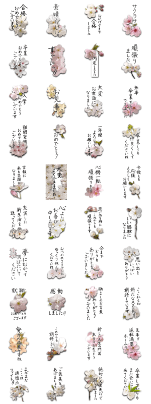 本物の桜の写真を添えた、合格、卒業、入学、就職などのお祝いに使える丁寧な手書きの言葉。おめでたい言葉や頑張った人をほめたり、労ったり、応援してくれた人へのお礼。 ※このスタンプはトークルームで大きく表示されるBIGスタンプです。Push Champy より発売