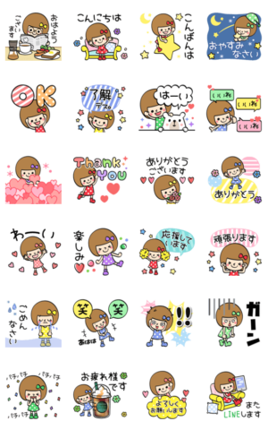 画面いっぱいに飛び出すポップアップスタンプ。おかっぱリボンでカラフルポップ!毎日使える基本のスタンプが盛り沢山。