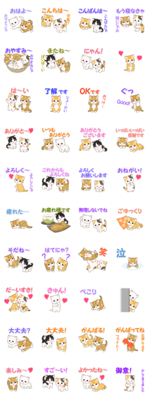 茶トラ・キジトラ・ハチワレ・三毛・白の子猫が仲良くころころ。よく使う言葉が見やすい大きな文字で入っていますので、年配の方にもどうぞ。つのっち より発売