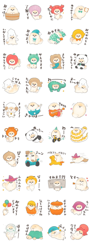 ポメラニアンのぽぽちがいろんな被り物をかぶった楽しいダジャレスタンプです。ぽこ より発売