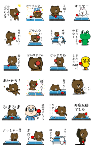 ブラウン&フレンズの卓球スタンプ。ピンポン.卓球好き.試合.ゲーム.練習.練習試合.誘い.挨拶.部活.クラブ.サークル.青春.家族.友達.先輩.後輩.先生.監督.☆ノンノノン作 ※BROWN & FRIENDS をみんなでつくろう!キャンペーン参加スタンプですノンノノン より発売