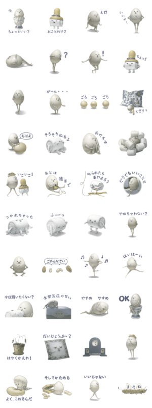 しおたにまみこ初の絵童話『たまごのはなし』が、スタンプになりました!絶妙な表情のたまごやマシュマロたち。毎日使ってね。ブロンズ新社 より発売