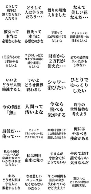 【ネタ/煽り/どや顔/面白い/モノローグ/返信/便利/使いやすい/ムカつく/友達/感想/適当/かっこいい/壮年/中二/暇/親切/宇宙/雑学/退廃/滅亡】