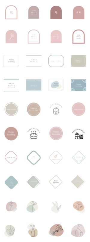シンプルでさまざまな用途で使えるおめでとうスタンプです。くすみカラーで大人かわいい雰囲気で作りました。ぜひお祝いメッセージに添えてお使いください♡