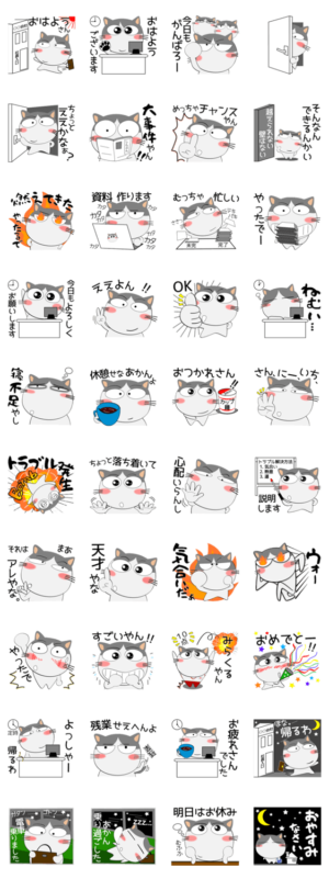 関西弁のハチワレ猫のスタンプ。会社員が毎日使える言葉、よく使う言葉を揃えました。朝から晩まで、基本的なあいさつも、ハプニングにも。敬語、やさしい言葉もあるよ。