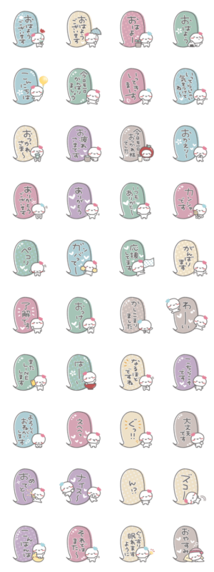 白玉がかわいく挨拶してくれるスタンプです。家族/カップル/日常/毎日使える/感謝/応援/かわいい/でか文字アルク より発売