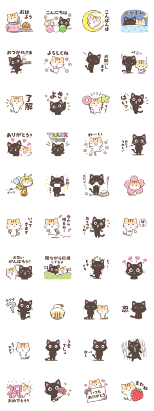 黒猫のクロと三毛猫のミケの、いつもより少しゆるっと可愛い春スタンプです。タナアキ より発売