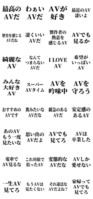 【ネタ/煽り/どや顔/面白い/返信/便利/使いやすい/ムカつく/友達/感想/適当/ガキ/かっこいい/あるある/ウザイ/暇/機械/音楽/映像】