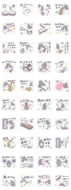 ハチワレ・ブチなどの白黒ネコ達の丁寧な敬語の音楽スタンプ♪ 弦楽器や打楽器、吹奏楽で活躍する楽器で、てみにゃん達が会話を彩ります。 てみにゃんシリーズ、第三弾!ONILAMP より発売