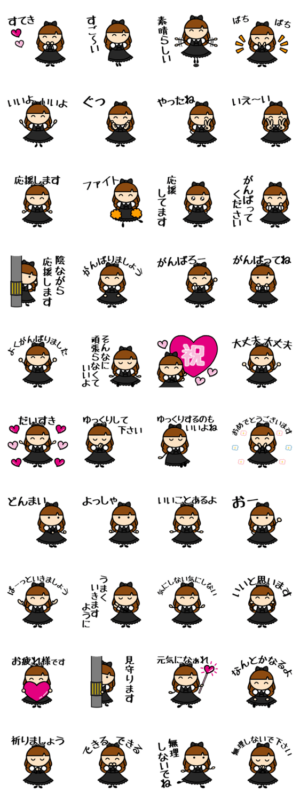 ゴシックロリータファッションの女の子第三弾。応援したり、元気を送ったりできるスタンプです。あばたー。アバター。ロリィタ。黒のフリルのお洋服。cheer