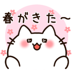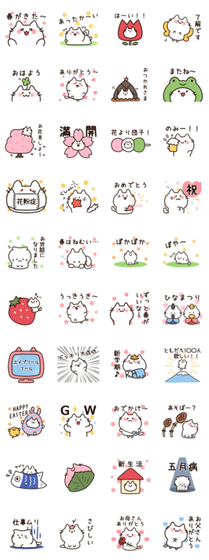 3月、4月、5月の春の季節や行事に使える、白猫ちゃんスタンプです。ひなまつり/イースター/お祝い/新学期/新社会人/母の日/父の日/桜/お花見/ネコ/動物/ゆるい/かわいい