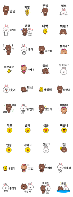 yellow23×LINEフレンズ。ハングルオンリースタンプ第2段!使いながら韓国語を覚えても◎海外や韓国のお友達にも送ってね♪#よく使う言葉#日常会話#リアクション#日常使い ※BROWN & FRIENDS をみんなでつくろう!キャンペーン参加スタンプですyellow23 より発売