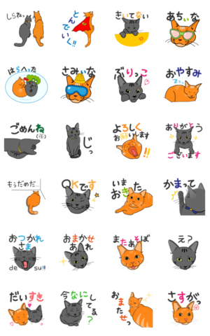 茶トラと黒トラの猫のスタンプです。使いやすい文字や挨拶を選びました!是非ご利用ください!/猫/ねこ/イラスト/文字入り/かわいい/使いやすいあまおでざいん より発売