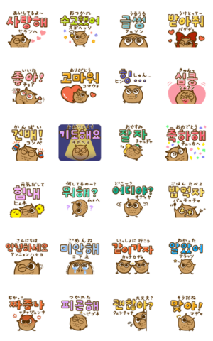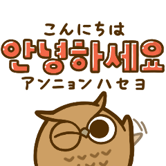 ミミズクの韓国語スタンプです。日本語訳とカタカナ発音つき。シンプルで使いやすいからシーンを選びません。光言社 より発売