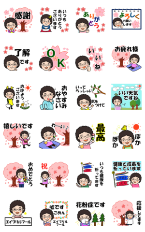おばちゃまスタンプシリーズの春編。見やすいデカ文字挨拶付きで桜、花見、エイプリルフール、鯉のぼり、花粉症等の春モチーフがたくさん。中高年女性、おばさん、お母さん
