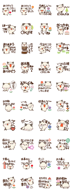 『ちびシャム』の春の花と、やさしい雰囲気のねこスタンプです。かわいいネコが穏やかに返事をします。しゃむ猫好きの方にぜひ。【かたこ】かたこ より発売