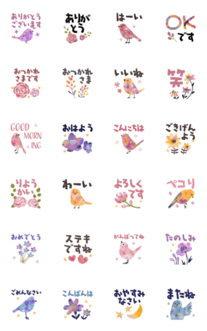 花と小鳥の動く挨拶スタンプです。女性らしい花柄メインのナチュラルで華やかな優しいスタンプです。