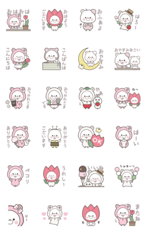 桜、チューリップなど春にピッタリのスタンプです♪くまのおうちのサクラちゃんとちびぽこが可愛く動きます。