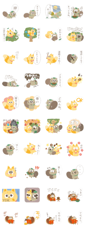 ヤマモトココロの「きつねとたぬきの絵本シリーズ」がスタンプになりました!たくさんつかってね!ヤマモトココロ より発売