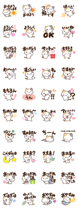 『小さい三毛猫』のナチュラル・ガーリーみけネコスタンプです。ていねいな言葉や、毎日のあいさつもあります。ミケねこが好きな方にぜひ。【かたこ】かたこ より発売