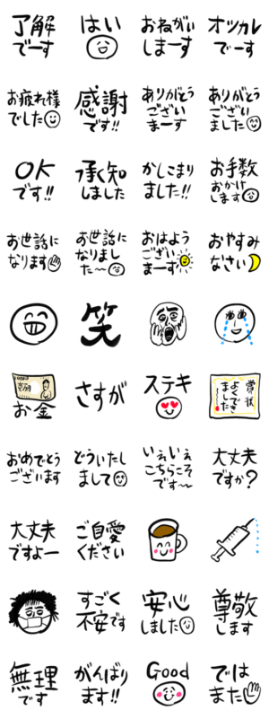 筆でささっと書いた敬語丁寧語スタンプです。毎日使える、デカ文字、大きなイラスト入り。イッレ・コスヤ より発売