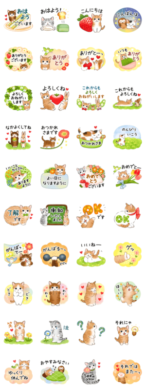 ねこたちのスタンプです。丁寧でやさしい挨拶などの基本のメッセージ多めの、毎日使えるセットです。春に使いやすいイラスト多め♪(敬語・かわいい)