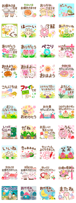 柔らかくて優しいデザインだけど、大きい文字で見やすい春のスタンプです。人気の柔らかくフワフワのデザインを植物やスイーツで表現しました♪母の日、父の日にも。