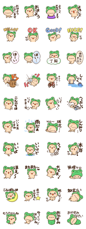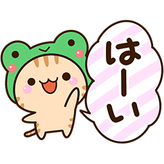 カエルのかぶりものをした、とらネコ。基本的な言葉やあいさつ等、毎日便利な猫スタンプです。被り物で印象が変わります。トラねこや蛙キャラ好きな方にぜひ。【かたこ】かたこ より発売