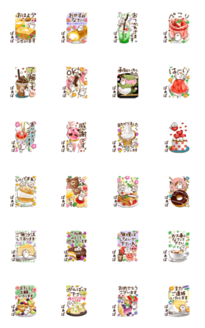ばぁば/バァバ専用79。大人可愛い/スイーツ/動く/気づかい/挨拶/丁寧/ケーキ/リアル/飯テロ/春/デカ文字/女子/猫/敬語/ねこうさぎの名前スタンプ/山田まぽん作。