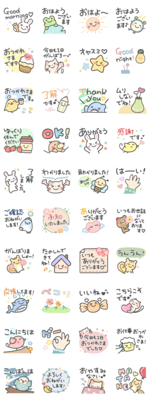 ふんわりとした絵柄で見やすく、人を選ばずにやさしく使えるスタンプの第6弾!返信や挨拶、応援などの日常的な言葉を敬語を含め収録した毎日使いやすいセットです♪