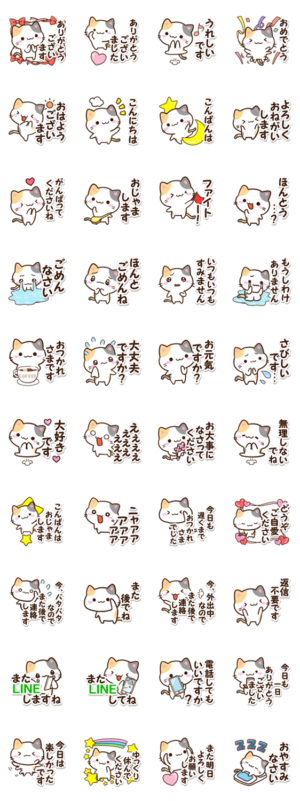 『小さい三毛猫』の優しい丁寧な言葉のスタンプです。縦書きで、敬語が多い、使いやすいミケネコスタンプ。仕事やママ友等に便利です。みけねこ好きな方にぜひ。【かたこ】