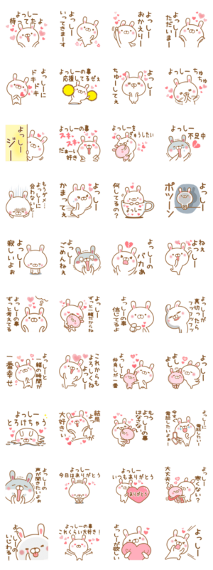 大好きなよっしーに気持ちを送るスタンプ。ヨッシー/よしの/よしこ/よしか/よしな/よしみ/よしえ/よしほ/みよし/吉田/吉村/吉岡/よしお/よしひろ/よしゆき/よしのぶ/吉原しん より発売