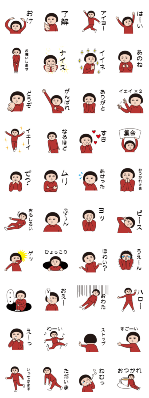 パッと見ダサいけど、昭和味があってかわいいスタンプ(芋ジャージ基本言葉編)自分で使ってもよし、プレゼントしてもよし。よく使うであろう言葉なのであると重宝します