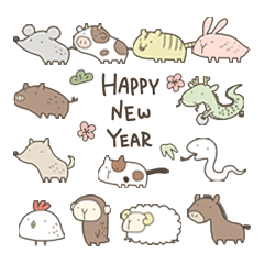 動物のようなへんないきもの第二弾。毎年使えるシンプルな年賀スタンプです。このスタンプはあけおめスタンプ2022の再販です。(年末年始/年賀状/あけおめ/ 十二支/新年)
